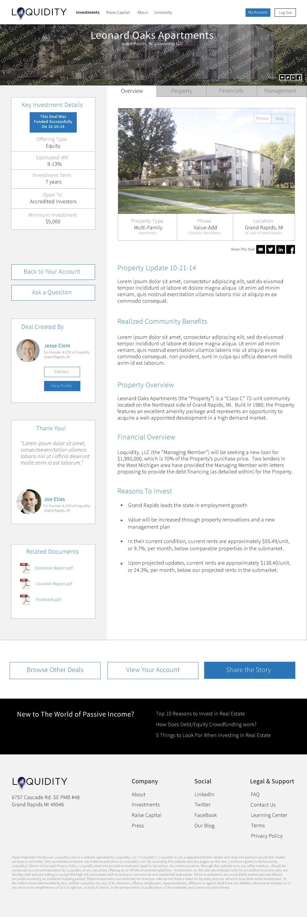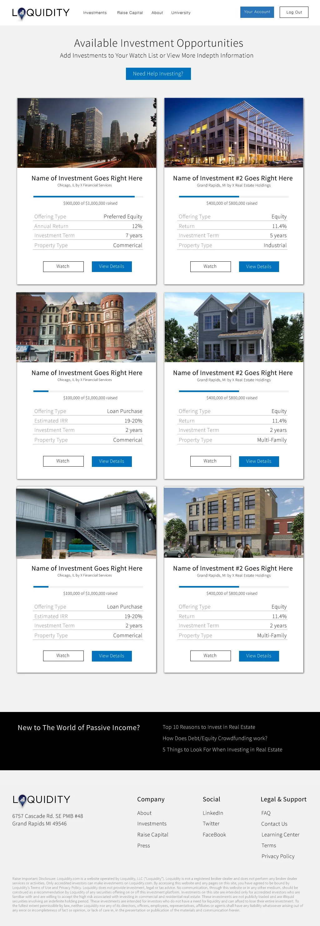 I spent 6 months advising the Midwest based real estate crowdfunding platform, Loquidity. My goal was to work on making the product user-friendly. That sounds simple... but evolving SEC crowdfunding/equity laws demanded the platform should accommodate both state and federal requirements. This was an additional challenge heaped on top of the already multifaceted on-boarding process Loquidity users faced. After understanding the requirements and limitations of 506c, 506b and state specific deals (i.e Michigan's MILE Act), it was on to how to ascertain if someone was an accredited investor or not. Then, of course, I had to design an app that would allow browsing and funding of all types of deals with that specific user in mind.